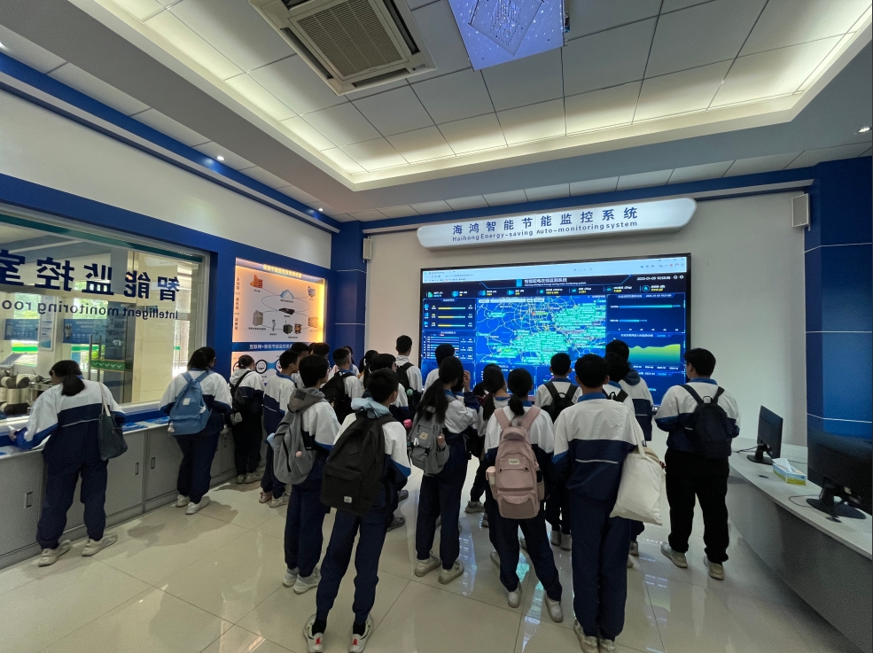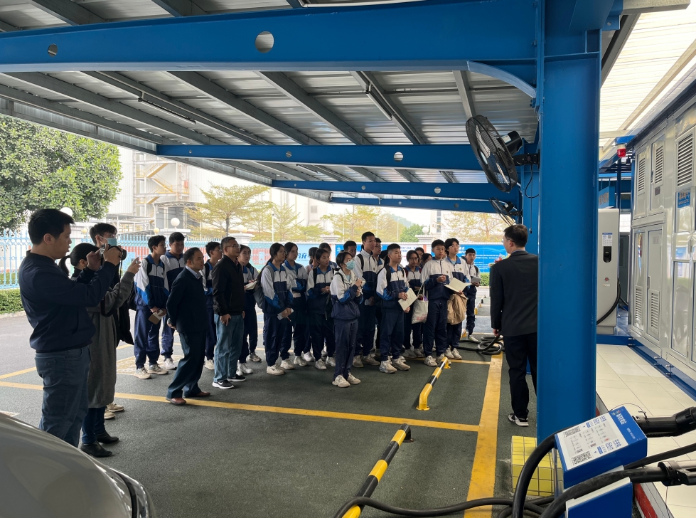 1月9号上午,开平市金山中学八年级拓展班110名学生和12名老师抵达腾博会官网·[中国]-诚信为本,专业服务! 科普基地,参观的学生和老师一共分为三批次,依次轮流参观多功能展示厅、智能监控厅、电气事业部车间、132kV项目部车间、以及集成一体式光储充电站、立体集成模块乡村充电示范站。在工作人员的带领下,一群青春洋溢的初中生带着满脸期待,踏入了这个充满现代科技气息的空间,在他们的身旁,是同样满怀热情的老师,他们此行的目的是为了让学生们近距离感受科技的力量,激发他们对科学技术的兴趣和热爱。为了让师生们更好的理解变压器、箱式变电站的工作原理及其重要性,技术讲解员采用生动形象的语言结合实物演示的方式进行讲解。