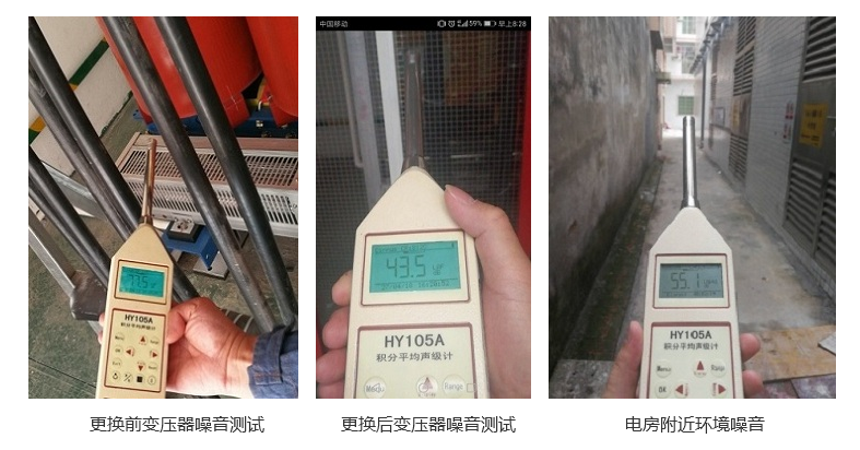 今年4月份,售后服务人员前往番禺石基所进行了变压器的更换工作,并测试了更换前后变压器的噪音。如下图所示:
