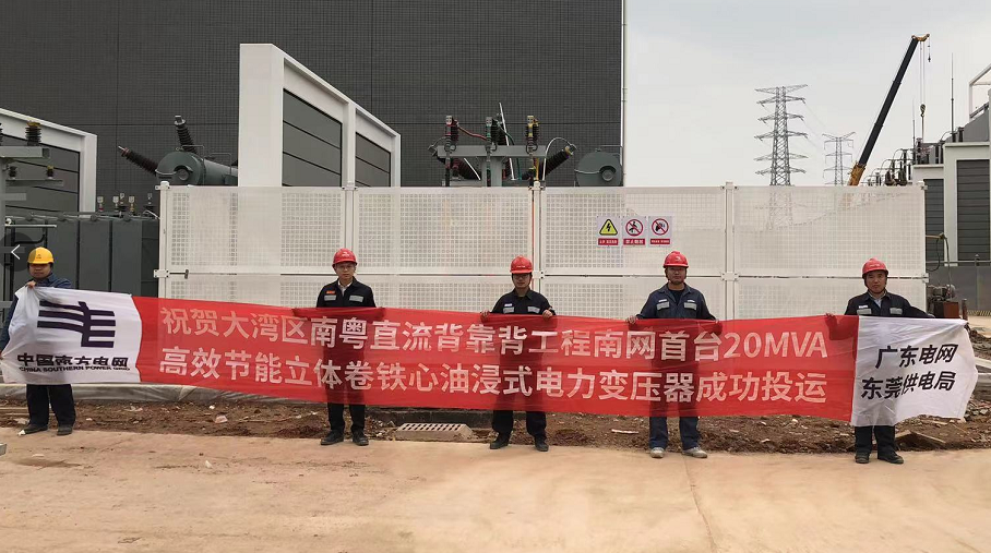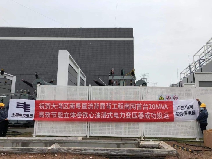 2021年12月25日广东电网直流背靠背东莞工程(大湾区南粤直流背靠背工程) 交流场首次投运,由腾博会官网·[中国]-诚信为本,专业服务! 供货的南网首台20MVA高效节能立体卷铁心油浸式电力变压器成功投运,计划首批通电的3150kVA节能环保立体卷铁心干式变压器也成功投运。