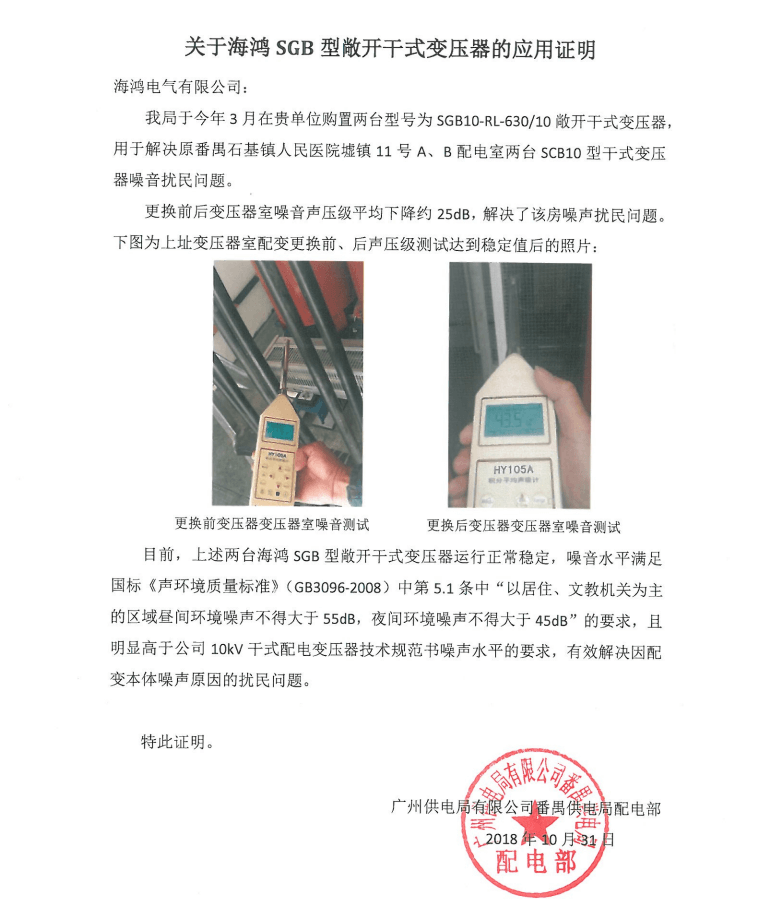 广州市番禺区石基人民医院是一家集医疗、保健、康复、健康教育、计划生育技术服务于一体的综合性“二级甲等”医院。医院原有变压器噪音太大,严重影响就医环境,影响医生工作、病人休息,后采用腾博官网诚信为本电气立体卷铁心变压器后,噪音由原来的77.5分贝下降到43.5分贝,杜绝噪音扰民的问题,且产品过载能力强、抗短路能力强满足医院高负荷用电需求。